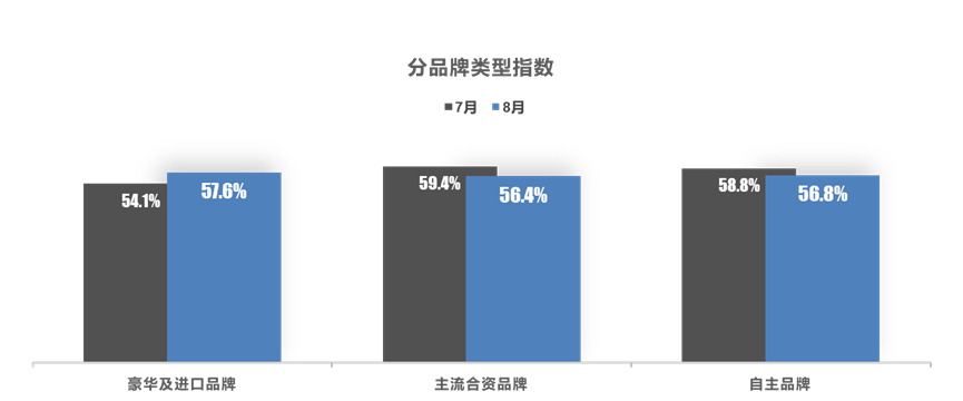 从分品牌类型指数看:8月进口及豪华品牌指数环比上升、合资品牌、自主品牌指数环比下降。