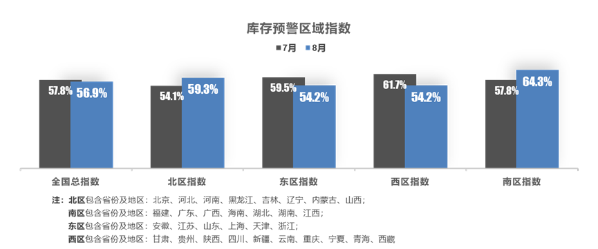从区域指数情况看:8月全国总指数为56.9%,北区指数为59.3%,东区指数为54.2%,西区指数为54.2%,南区指数为64.3%。