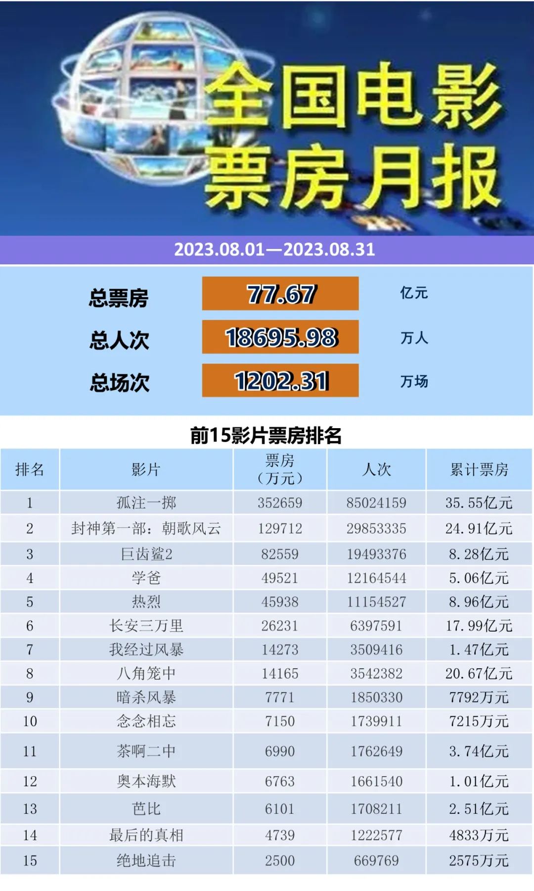 电资办:2023年8月全国电影票房月报 更多阅读:电资办:2022年12月全国电影票房月报电资办:2024年4月全国电影票房月报电资办:2024 年 10 月全国电影票房月报电资办:2016年2月全国电影票房月报电资办:2016年3月全国电影票房月报电资办:2018年10月全国电影票房月报电资办:2017年4月全国电影票房月报电资办:2024年5月27日-6月2日全国电影票房周报电资办:2024年5月6-12日全国电影票房周报电资办:2023年6月12-18日全国电影票房周报电资办:2024年5月13-19日全国电影票房周报电资办:2024年6月10日-6月16日全国电影票房周报电资办:2023年6月26日-7月2日全国电影票房周报电资办:2023年8月21-27日全国电影票房周报电资办:2023年8月28日-9月3日全国电影票房周报