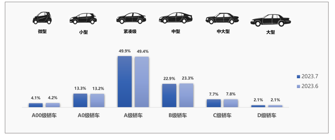- 2023年7月,各级别轿车的整体销量来看,A级轿车仍旧是二手车市场中最热销的车型,占比为49.9%,环比增长了0.5%,其次是B级轿车平均占比22.9%,环比下降了0.4%。C级轿车占7.7%、环比下降了0.1%。D级轿车占2.1%,较上月基本持平。A0级轿车占13.3%,环比增长了0.1%。A00级轿车占4.1%,下降了0.1%。