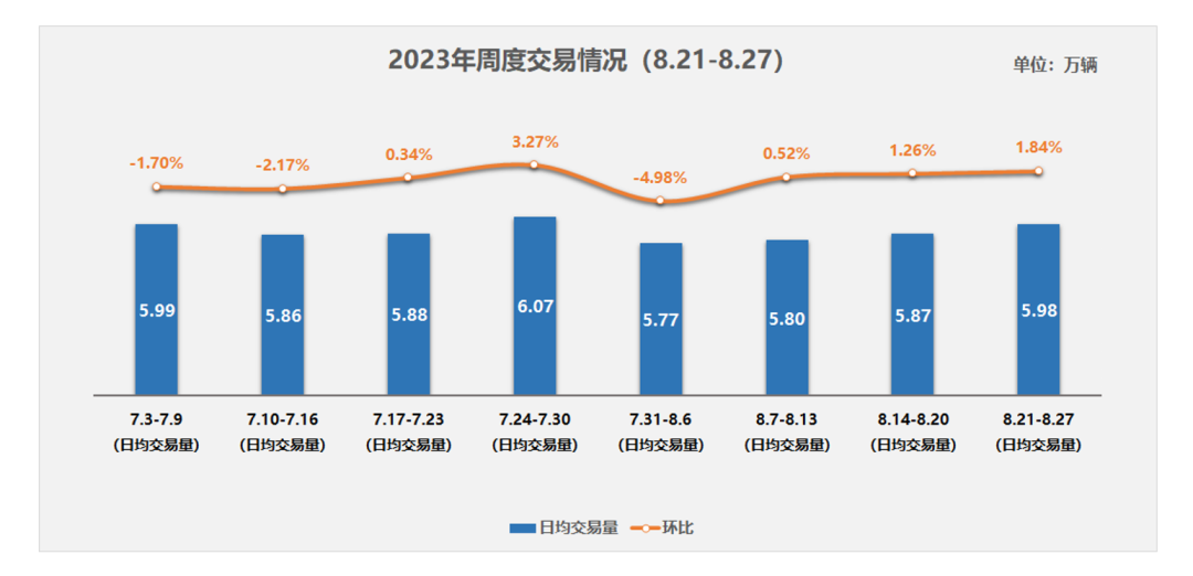 - 8月第四周二手车市场日均交易量5.98万辆,环比增长1.84%,与上月同期相比下降了1.5%。从周度表现来看8月份市场的集客和成交能力均不及7月份的同期,根据同口径计算8月1日-27日,二手车交易量134.6万辆,较7月同期下降1.5%。