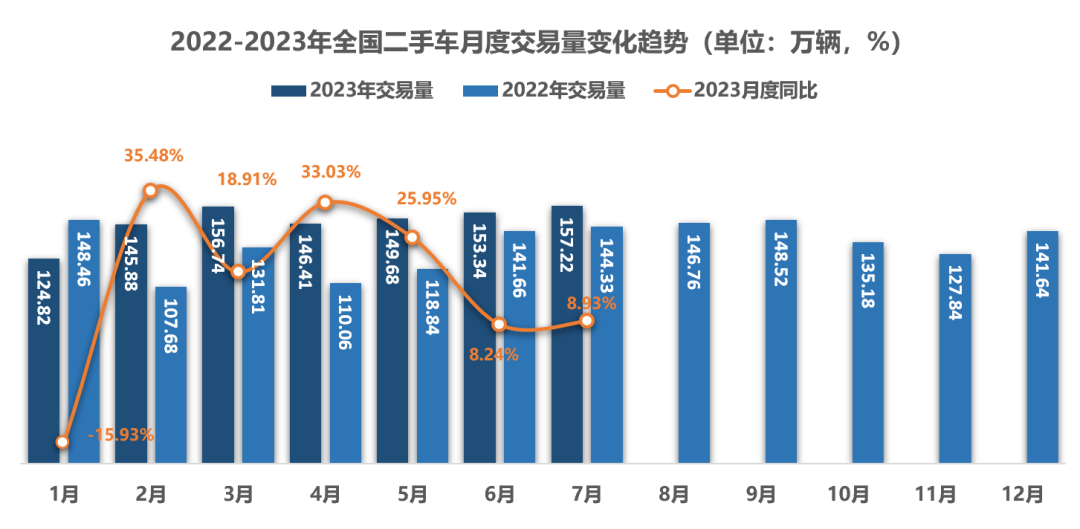 - 2023年7月,全国二手车市场交易量157.22万辆,交易量环比增长2.53%,同比增长8.93%,交易金额为1029.62亿元。