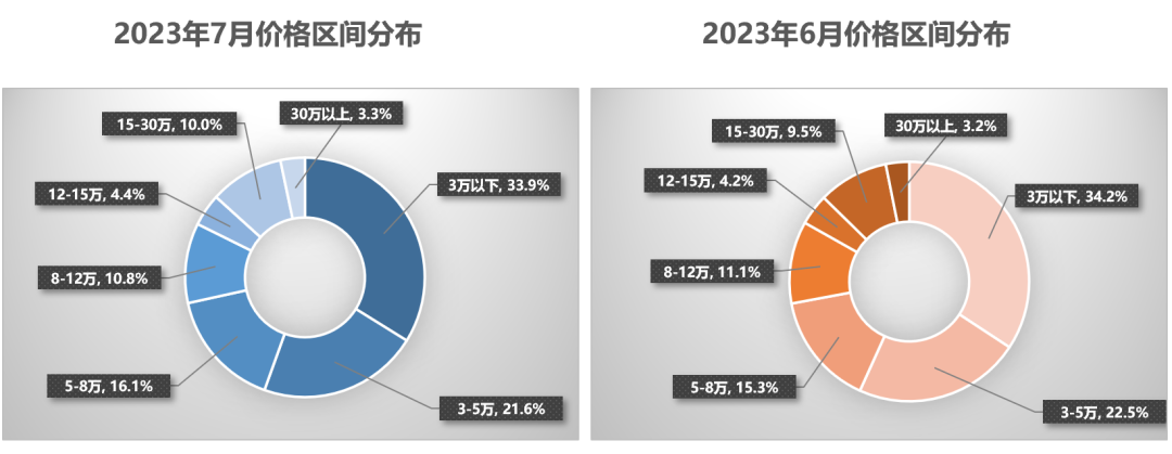 - 2023年7月,8-12万、12-15万、30万以上的新能源二手车占比有所增加,其中8-12、12-15万车型分别占10.4%、7.8%,环比分别增加了1.2个点;30万以上的车型占3%,环比增加了0.3个点。