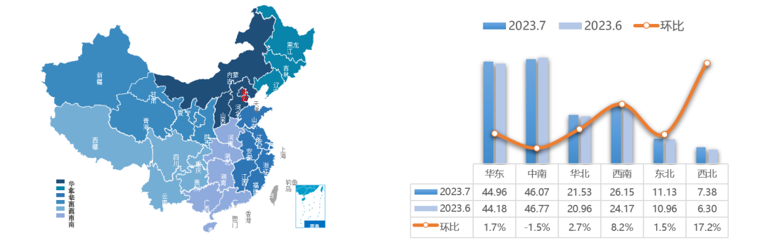 - 2023年7月,全国六大区中仅中南地区环比6月有所下降,其他各区域均有不同程度的增长。