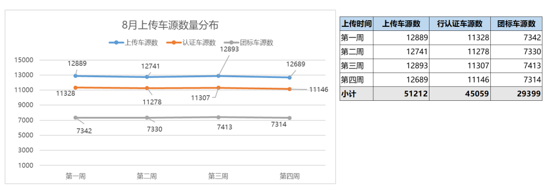- 2023年8月,市场较7月份有所回暖,行认证共接收到上传车源数据51212台,较,7月份增加约7%,其中符合行认证标准的车源数据45059,41541台、符合团标的数据29399,均增加约8%。