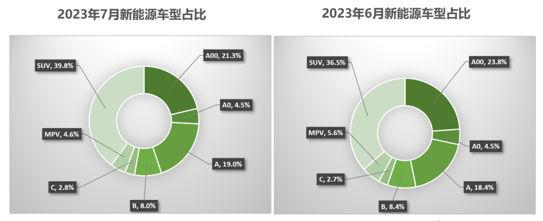 - 从车型结构上看,7月份新能源二手车中,SUV车型增速较快,A00级车型下降相对明显。