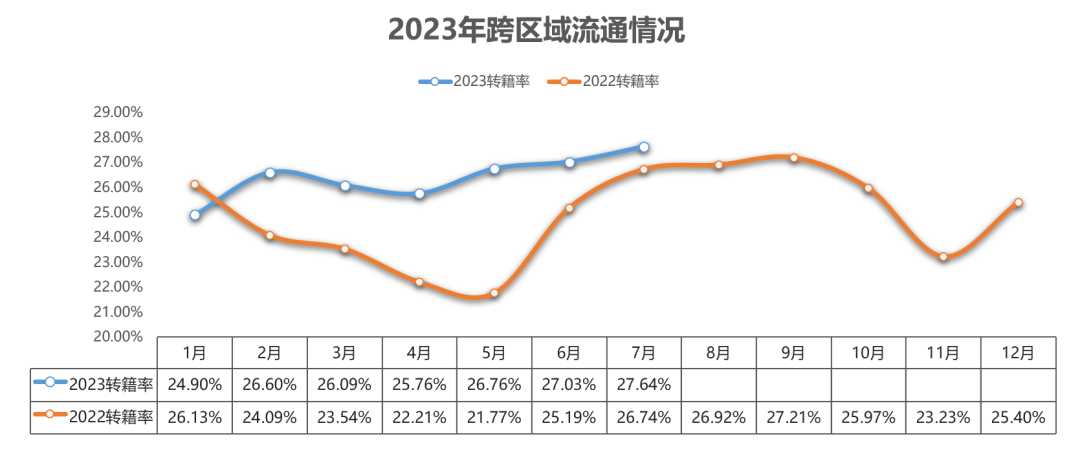 - 2023年7月,全国转籍比例排名前五的省份是北京、上海、安徽、湖北、江苏。其中北京、上海、江苏转籍率较上月略有增长,安徽、湖北、环比出现小幅下降。