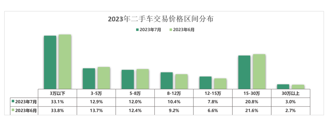 - 7月,二手车交易价格区间在3万元以下的车辆市场占比最大,占33.9%,环比下降了0.4个点。其次是3-5万的车辆占21.6%,环比下降了0.9个点;8-12万车辆占10.8% ,环比下降0.3个点;5-8万的车辆占16.1%,环比增长了0.8个点。12-15万、15-30万、30万以上车辆分别增长了0.2、0.5、0.1个点。
