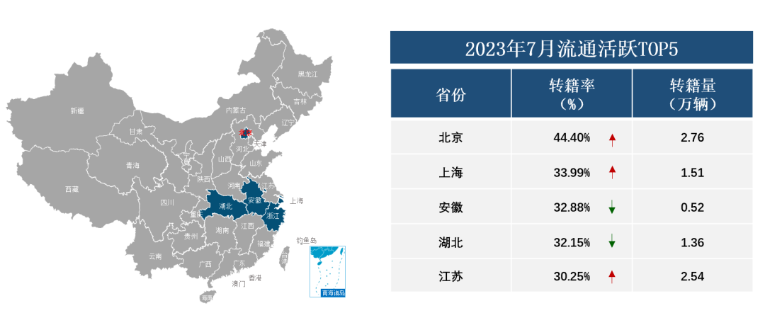 - 安徽转籍率为32.88%,环比下降0.2个点,转籍量为0.52万辆;