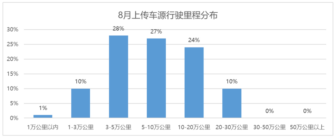 - 其中,1-3万公里以内的“准新车” 与较7月增加了2%,3-10万公里以内的“较新车” 较上月降低了1%,10万公里以上的“老旧车” 与上月持平;