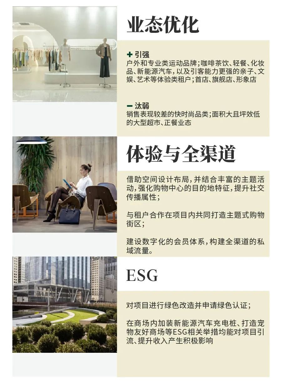 零售物业是典型的重运营资产类别,线下消费疫后反弹且向常态化回归的过程也是投资者通过资产运营快速提升项目表现的重要窗口期。结合当前国内消费市场的发展趋势,我们建议投资者和业主可以考虑从以下三个维度着手: