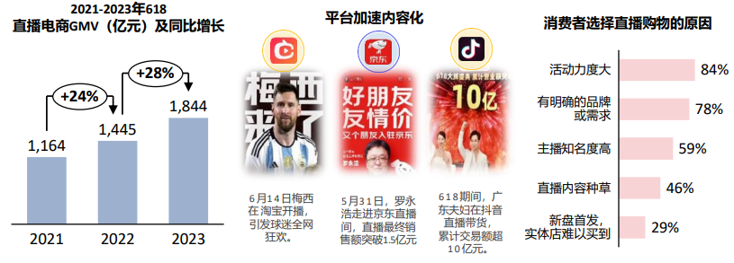 在以价格优势和内容营销为主力的618购物节中,直播电商已经成为各大平台关注的焦点和重要的竞争战场。无论是淘宝、京东这样的电商巨头,还是抖音、快手、小红书这样的内容平台,都在积极布局,加大资源投入,借助直播这一形式驱动业务迅速发展。随着直播电商行业的蓬勃发展,它在促进线上消费繁荣方面的作用日益明显,通过加强内容生态建设,以更加优质的内容促进消费转化,吸引并引导消费者更加理性、高效地消费。