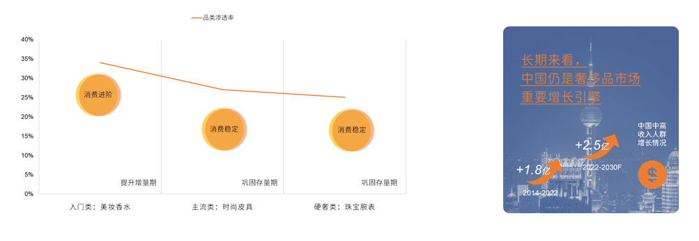就奢侈品子品类渗透率来看,由高到低依次为大牌彩妆香水、大牌时尚皮具及腕表珠宝。入门类奢侈品——即大牌彩妆香水——基于消费进阶需求扩充增量,而主流/硬奢类——大牌时尚皮具/高档腕表珠宝——聚焦存量经营。
