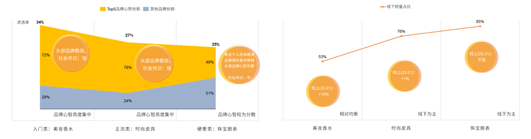 - 品类阶段特征:入门类基于消费进阶需求扩充增量,主流/硬奢类聚焦存量经营
