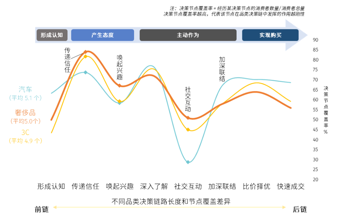 奢侈品消费的个性化属性更强也更注重整体品牌体验,因此媒介内容承载的唤起兴趣、社交互动角色更为凸显。奢侈品消费者决策整体更强调前、中链: