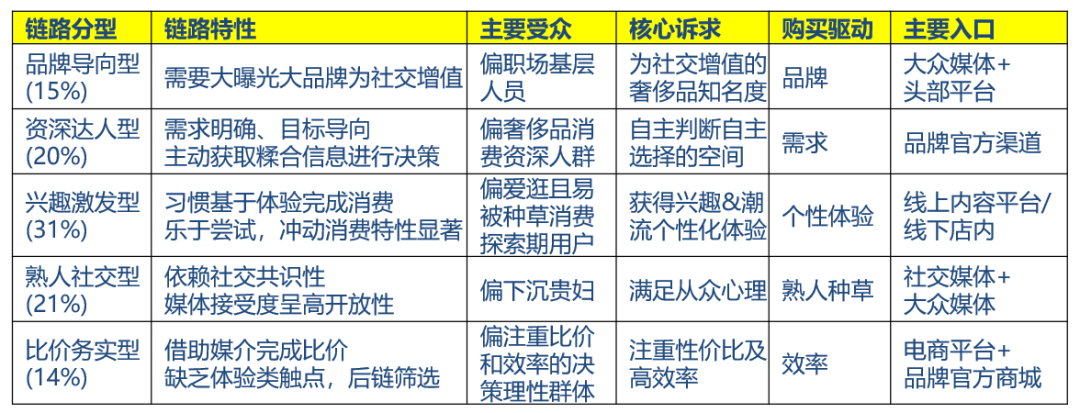 结合各分型的链路特征,理解其主要受众及核心诉求,抓住主要入口与购买驱动,有机匹配渠道与内容,助力营销提效。