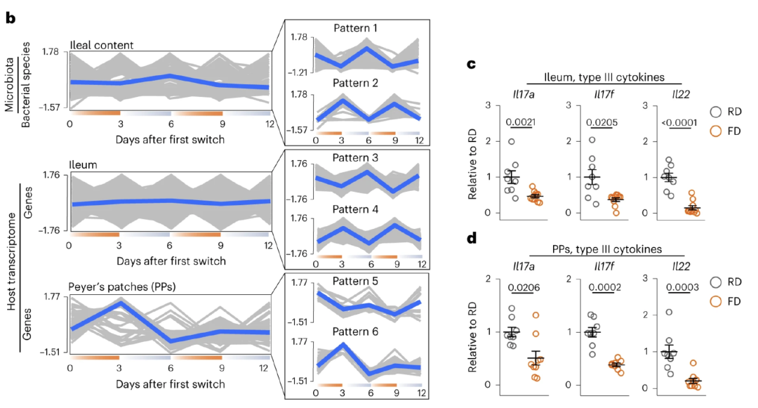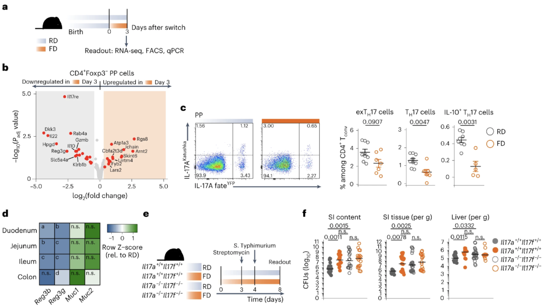 事实上,短期的“大餐”还进一步改变了肠道的免疫景观,导致CD4+ T细胞区受到抑制,并下调了黏膜III型细胞因子IL17a、IL17f和IL22的表达。上述细胞因子的减少,使得肠道对沙门菌伤寒血清型更易感,自然更易受到细菌的侵害。