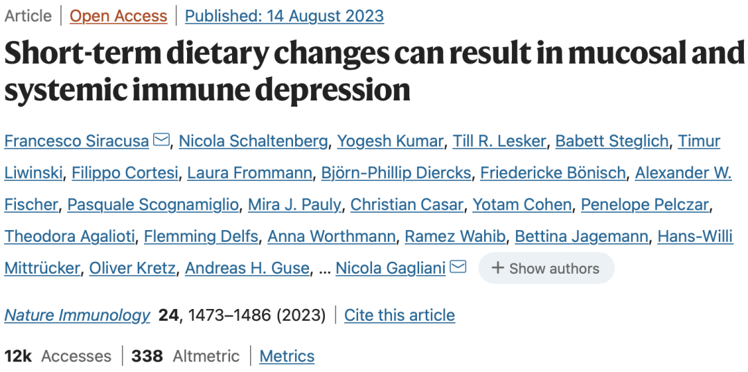 Siracusa, F., Schaltenberg, N., Kumar, Y. et al. Short-term dietary changes can result in mucosal and systemic immune depression. Nat Immunol 24, 1473–1486 (2023). https://doi.org/10.1038/s41590-023-01587-x