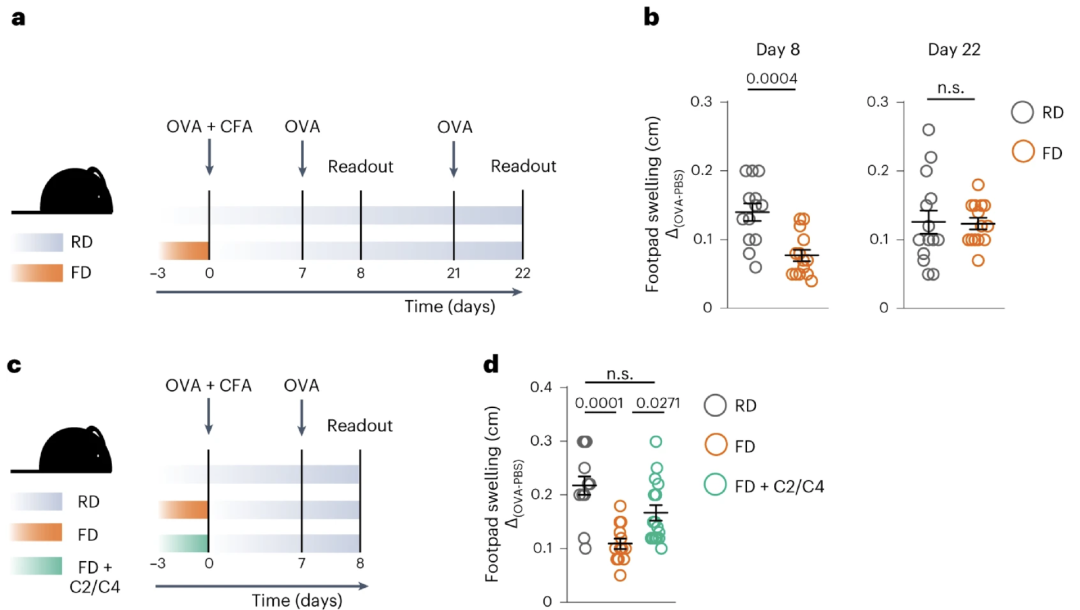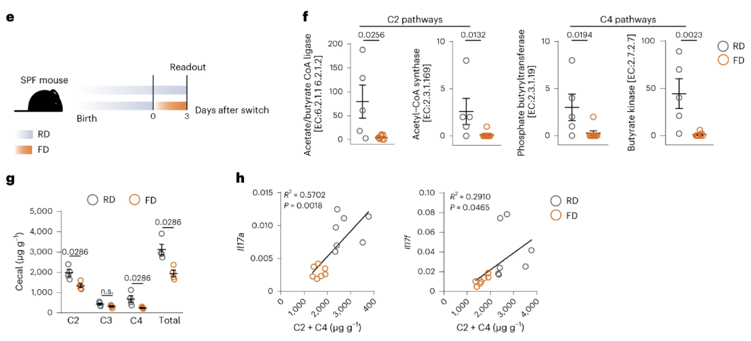 乙酸盐和丁酸盐均属于常见的短链脂肪酸(SCFAs)。上述发现意味着,介导免疫稳态的关键是那些将膳食纤维发酵成SCFAs的肠菌种类,与RD相比,FD所含的膳食纤维更低,自然生成的SCFAs也更低。而SCFAs的减少会改变I型和III型免疫反应的共同基本机制,比如CD+4 T细胞的代谢,进而损害肠道和全身免疫功能。