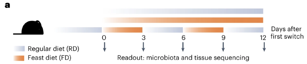 本实验中,研究者采用富含动物源性脂肪但缺乏膳食纤维的能量密集饮食模式(FD)来模拟常见的“大餐”,每隔3天将其与常规饮食(RD)进行交替,累计四次转换。