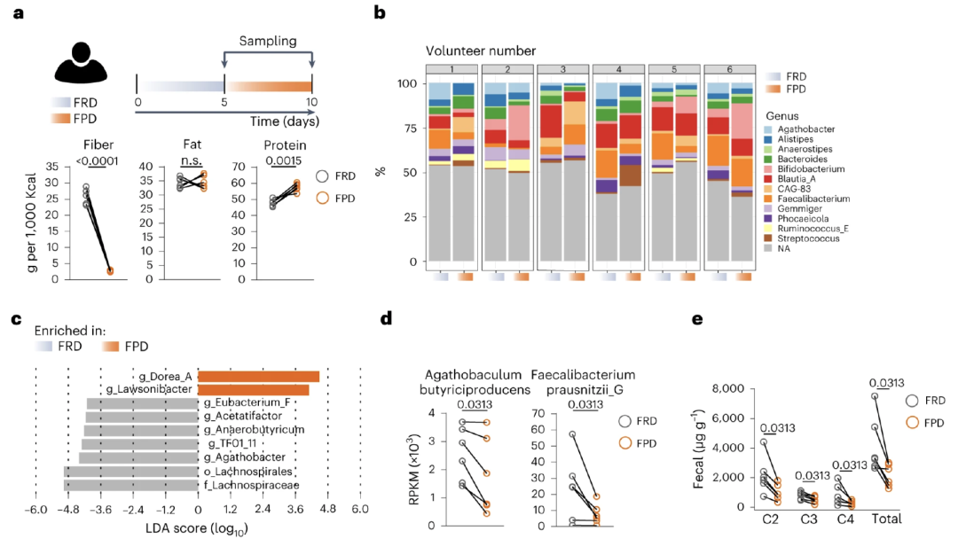 当然,仅限于动物实验似乎欠缺说服力,研究者同样在人群试验中观察到类似的现象。在健康参与者中交替富含纤维的膳食(FRD)和缺乏纤维的膳食(FPD),每5天为一个切换周期。