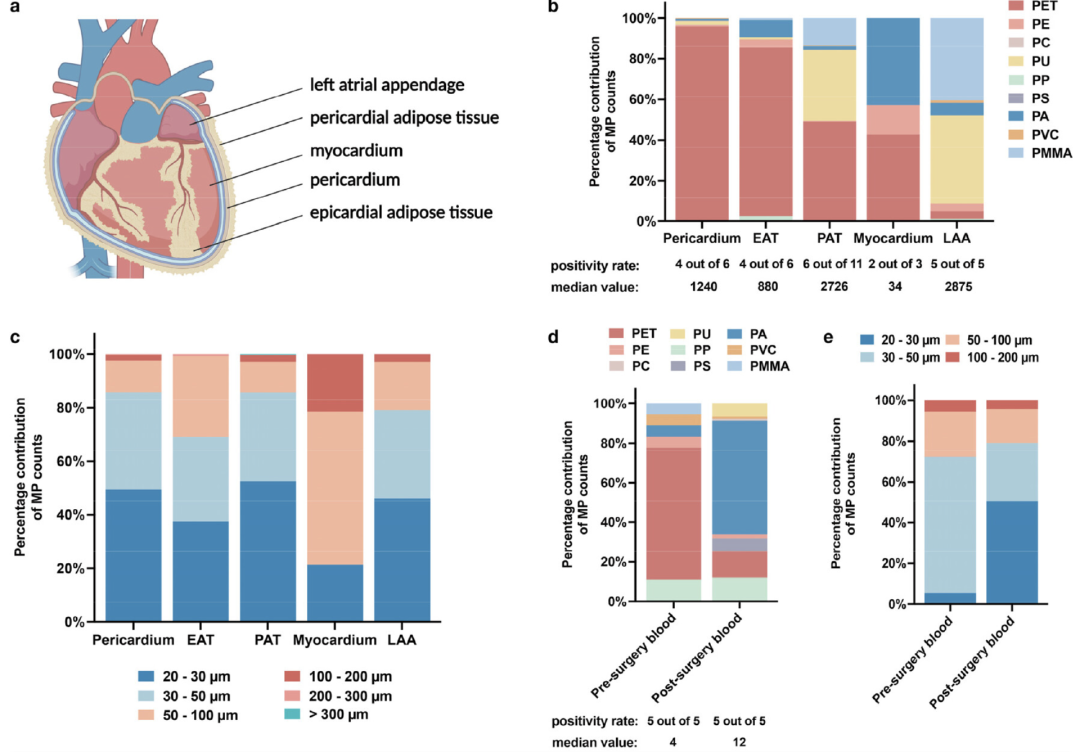 为了获得人体内器官存在微塑料的“直接证据”,研究者招募了15名正在经历心脏手术的参与者,最终收集到6个心包样本、6个EAT样本、11个PAT样本、3个心肌样本和5个LAA样本。