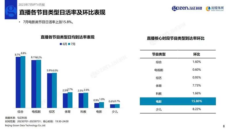 全天时段中,CCTV-6电影、CCTV-14少儿在线率分别上涨8.0%、10.9%;