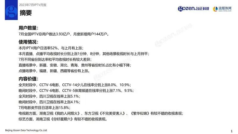 7月全国IPTV总用户数达3.93亿户,月度新增用户144万户。