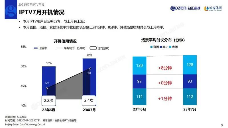本月直播、点播分别上涨1分钟、8分钟,其他场景平均收视时长与上月持平;