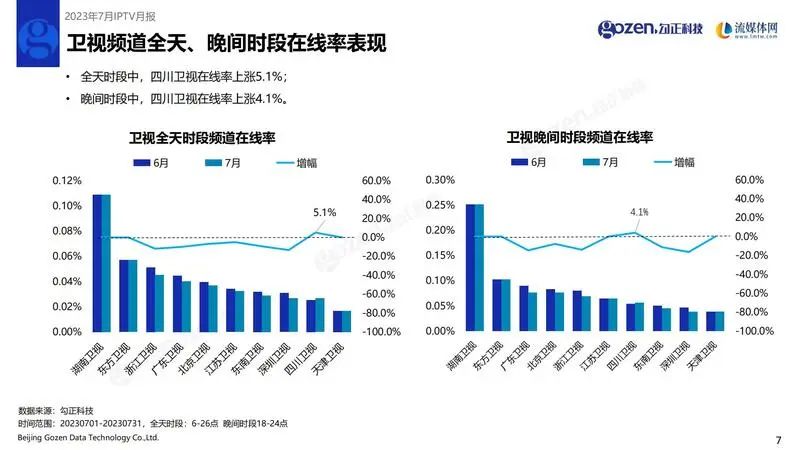 晚间时段中,CCTV-6电影、CCTV-5体育频道在线率分别上涨7.1%、9.5%;