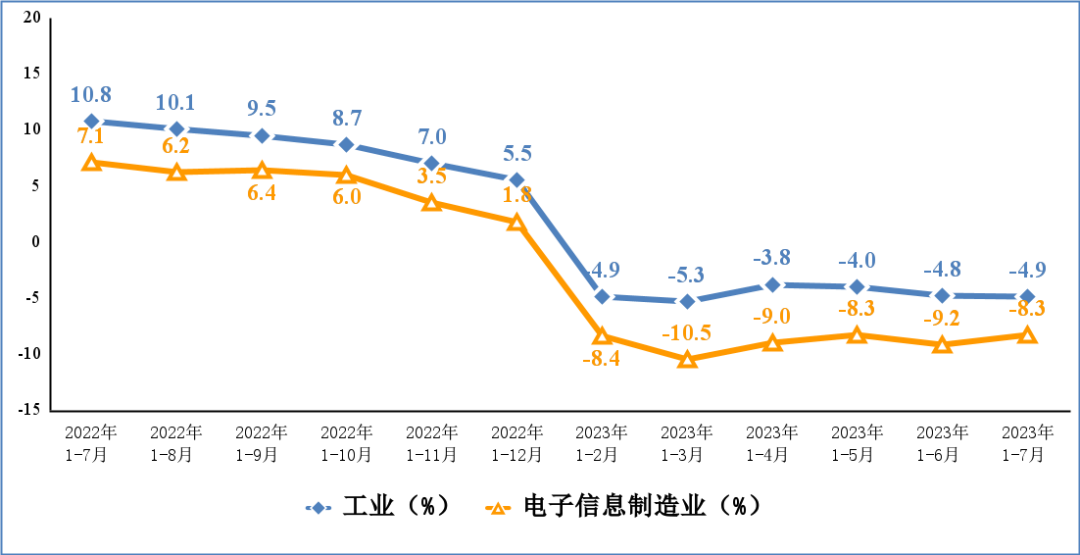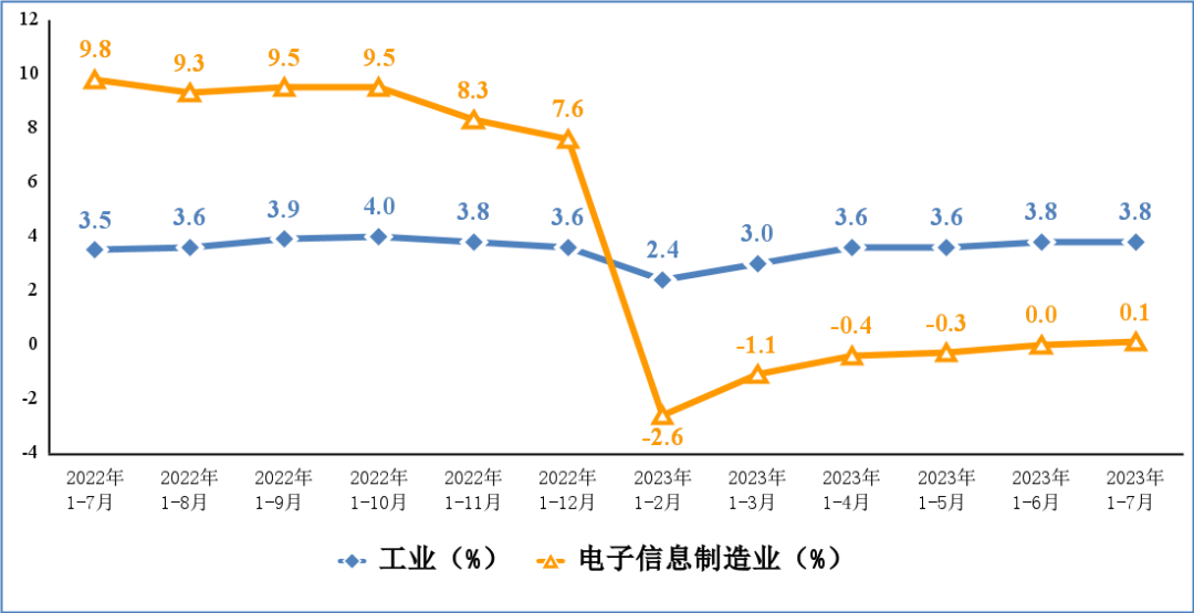 1—7月份,规模以上电子信息制造业增加值同比增长0.1%,增速较上半年提高0.1个百分点;增速分别比同期工业、高技术制造业低3.7个和1.5个百分点。7月份,规模以上电子信息制造业增加值同比增长0.7%。