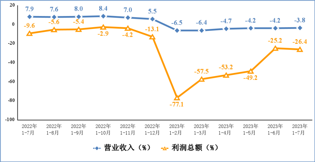 1—7月份,规模以上电子信息制造业实现营业收入7.98万亿元,同比下降3.8%,较上半年降幅收窄0.4个百分点;营业成本6.98万亿元,同比下降3.3%;实现利润总额2763亿元,同比下降26.4%,较上半年降幅加深1.2个百分点;营业收入利润率为3.5%,较上半年下降0.1个百分点。