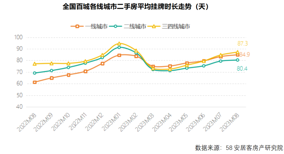 2023年8月,全国百城各线城市二手房挂牌时长环比都出现了小幅上涨的态势,表明当前楼市交易持续低迷,购房者依旧处于观望。三四线城市的二手房挂牌时长涨幅相对最大,为3.0%,挂牌时长也是相对最长为87.3天,二线城市挂牌时长涨幅最小,为1.2%,而一线城市挂牌时长最短,为80.4天。