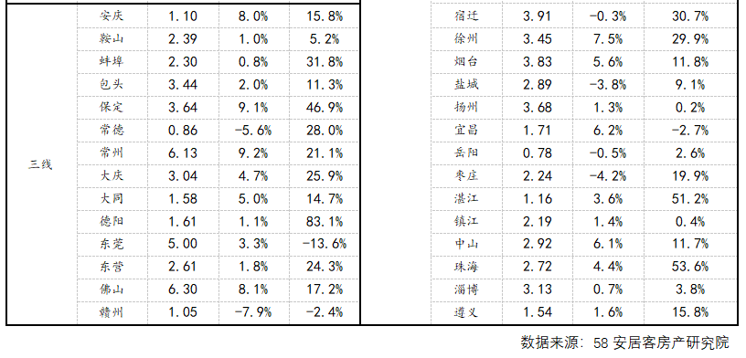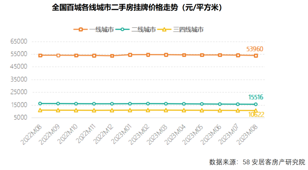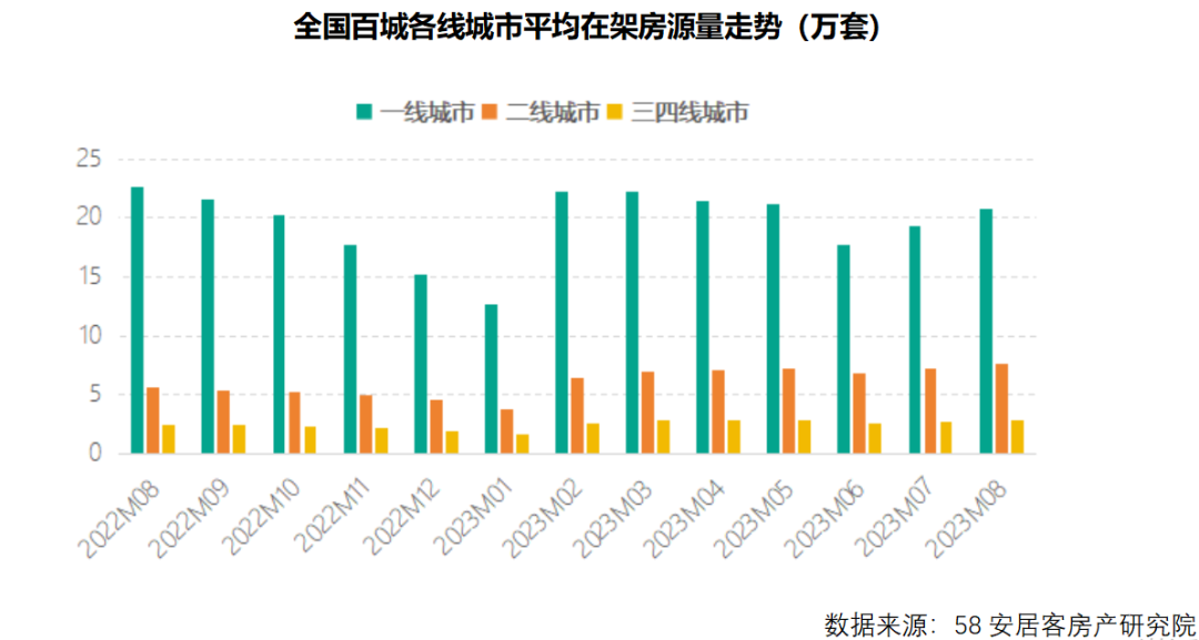 据58安居客研究院统计数据显示:2023年8月,一线城市二手房平均在架房源为20.79万套,环比增加7.3%,二线城市二手房平均在架套数为7.65万套,环比增加6.4%,三四线城市二手房平均在架套数为2.82万套,环比增加3.3%。