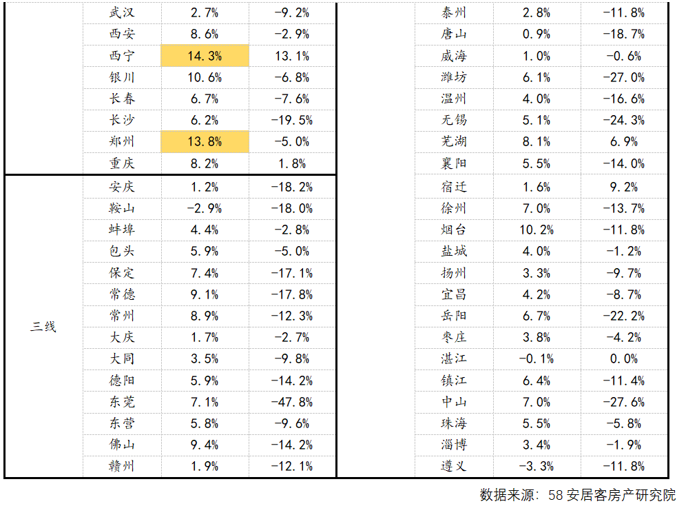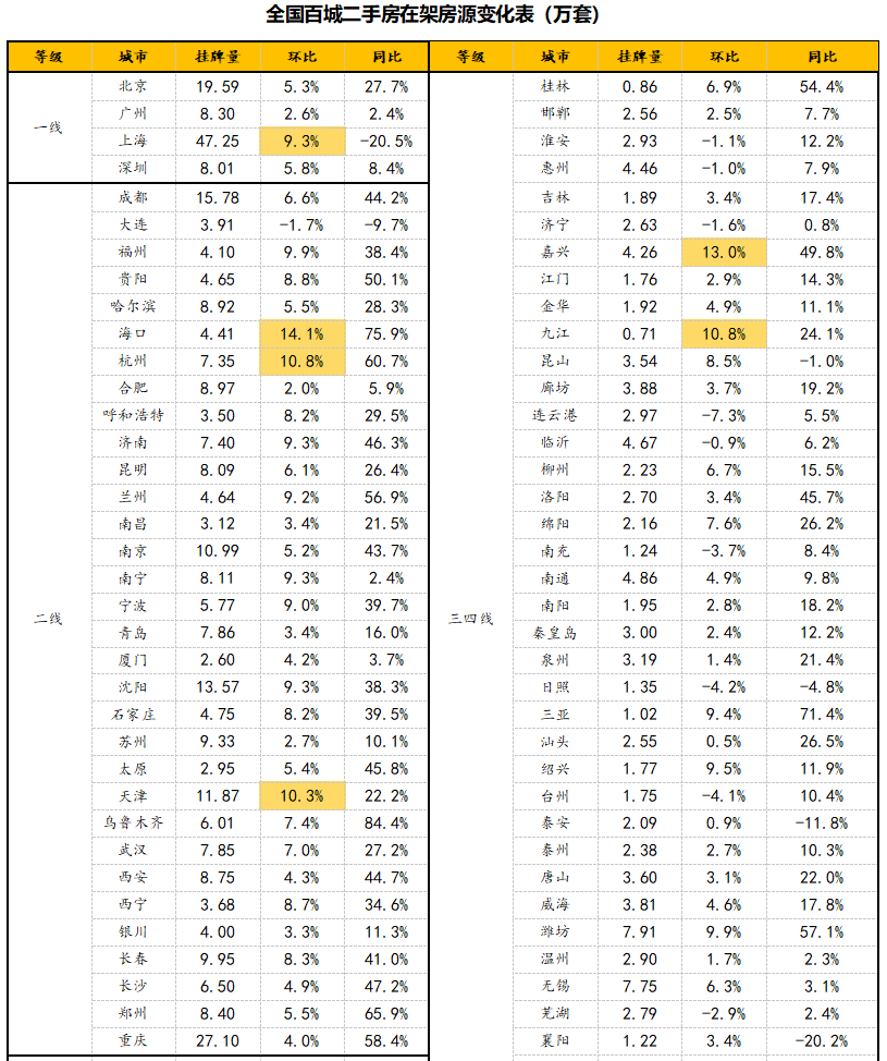 从全国100个二手房热点城市来看,二手房在架套数环比上涨的城市有84个,相比上月减少1个。一线城市中,上海的二手房挂牌量涨幅最大,为9.3%,主要是前期上海市二手房调整幅度最大,那么在当前政策集中出台,尤其是认房不认贷等相关政策落地后,房东挂牌意愿快速提升相关。二线城市中,杭州、海口和天津的回升幅度最大,其中杭州在全面放宽落户政策的利好之下,刺激房东挂牌意愿的提升。