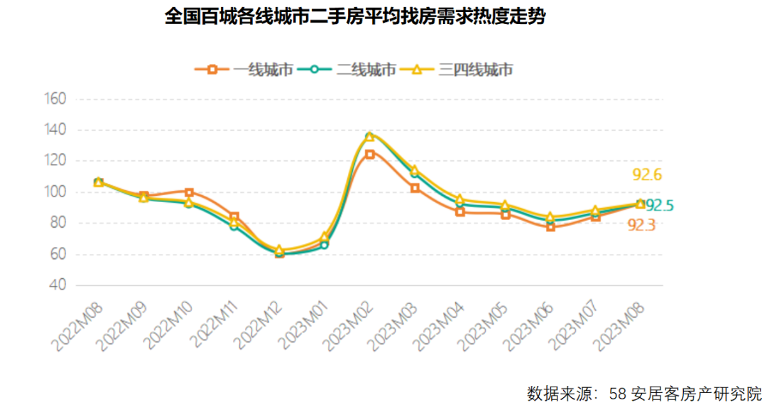 2023年8月,全国二手房找房热度持续处于回升中,尤其是一二线城市找房热度回升幅度相对最为明显,一线城市上涨9.8%,二线城市上涨7.1%;三四线城市上涨4.8%,相比上月涨幅略有回落。