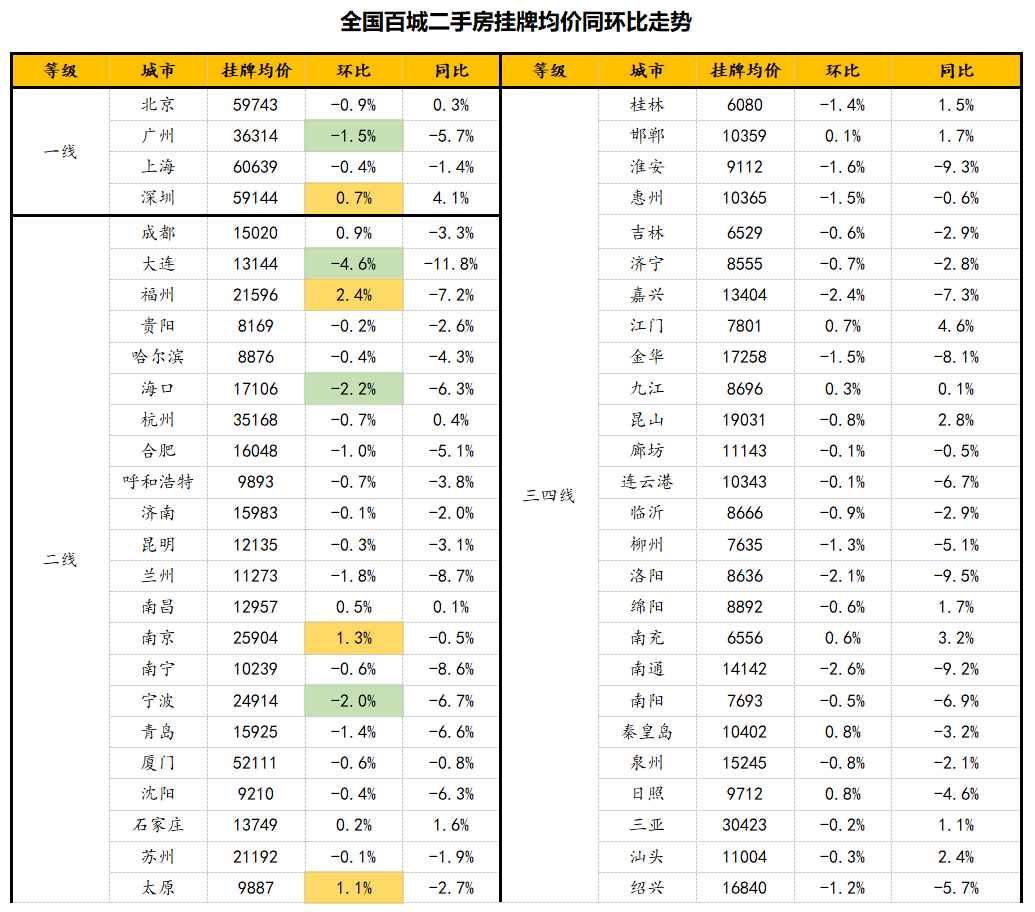 2023年8月,全国各线城市二手房持续出现回落,尤其是二线和三四线城市,已连续出现了6个月的下跌,本月这两线城市挂牌均价分别下跌0.4%和0.5%;一线城市二手房挂牌均价环比下跌0.4%,本月一线城市的二手房调整幅度也是近期降幅最大。