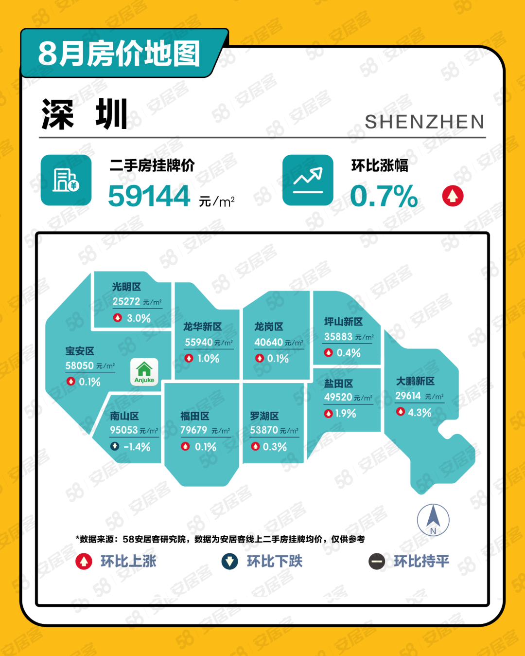58安居客房产研究院数据显示,北京2023年8月份的二手房挂牌价格为59743元/平方米,环比下跌0.9%,东城、昌平、朝阳、石景山区域的二手房挂牌价格环比上涨。上海8月份二手房挂牌价格为60639元/平方米,环比下跌0.4%,奉贤、杨浦、松江、浦东地区的二手房挂牌价格环比上涨。广州8月二手房挂牌价格为36314元/平方米,环比下跌1.5%,从化、天河、番禺、白云、越秀、黄埔区域二手房挂牌价格环比上涨。深圳8月二手房挂牌价格为59144元/平方米,环比上涨0.7%,南山区域二手房挂牌价格环比下跌。