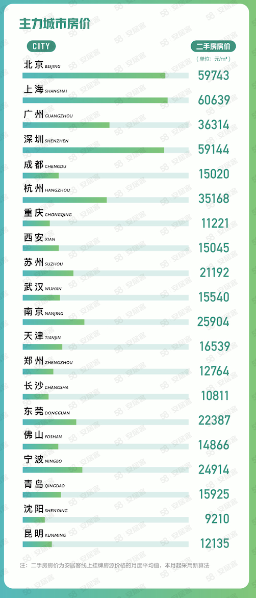 据58同城、安居客《8月国民安居指数报告》显示,8月全国65个主要城市二手房挂牌均价为17283元/㎡,环比微跌0.49%,65城中有20城二手房挂牌房价环比上涨。从主力城市的二手房挂牌均价来看,一线城市中,北京二手房挂牌均价为59743元/㎡、深圳为59144元/㎡、上海为60639元/㎡、广州为36314元/㎡。二线城市中,杭州二手房挂牌均价为35168元/㎡、南京为25904元/㎡、天津为16539元/㎡、成都为15020元/㎡、武汉为15540元/㎡、郑州为12764元/㎡、长沙为10811元/㎡。