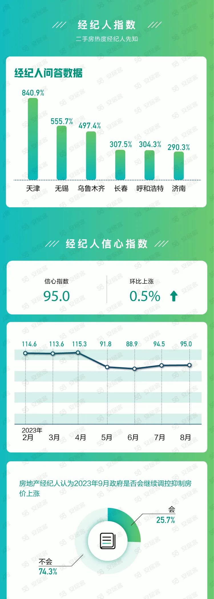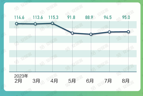 2023年8月经纪人信心指数为95.0,环比上涨0.5%。8月有74.3%的房地产经纪人认为9月政府将不会继续调控抑制房价上涨,有41.6%的经纪人认为二手房成交量将基本持平,有35.1%的经纪人认为9月二手房需求量将上涨。