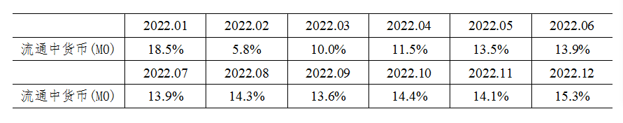 注4:自2022年12月起,“流通中货币(M0)”含流通中数字人民币。12月末流通中数字人民币余额为136.1亿元。修订后,2022年各月末M1、M2增速无明显变化。修订后M0增速如下:
