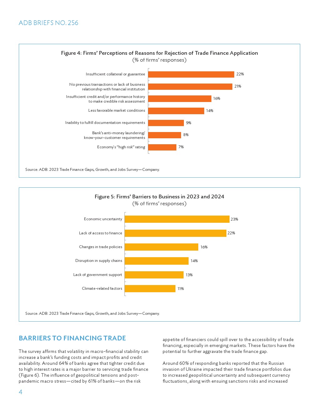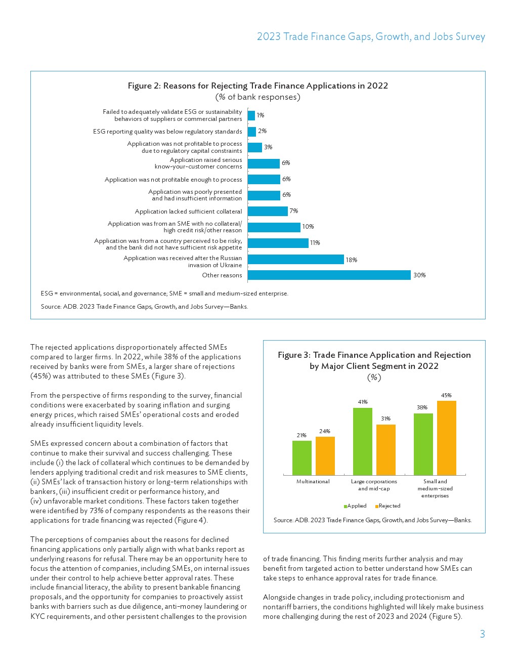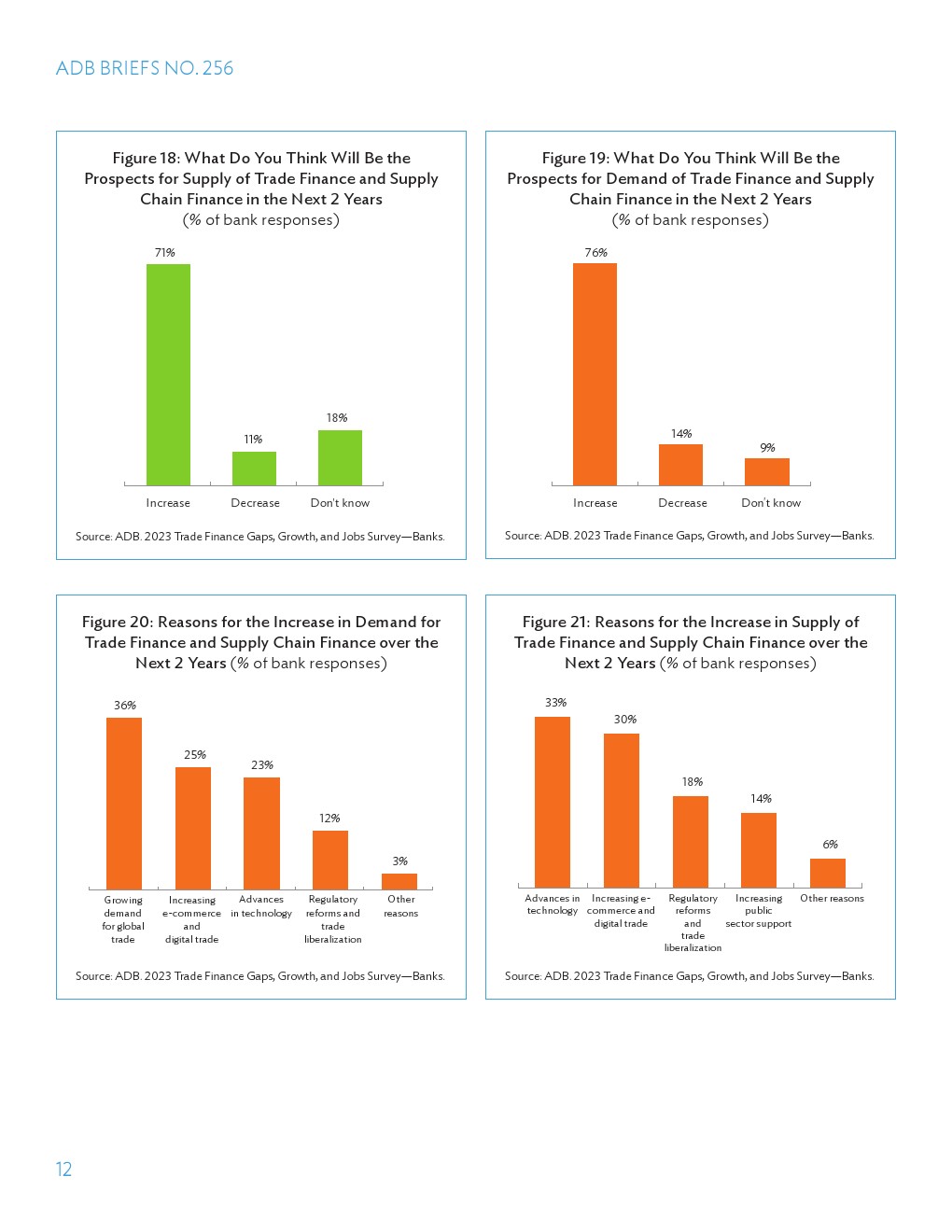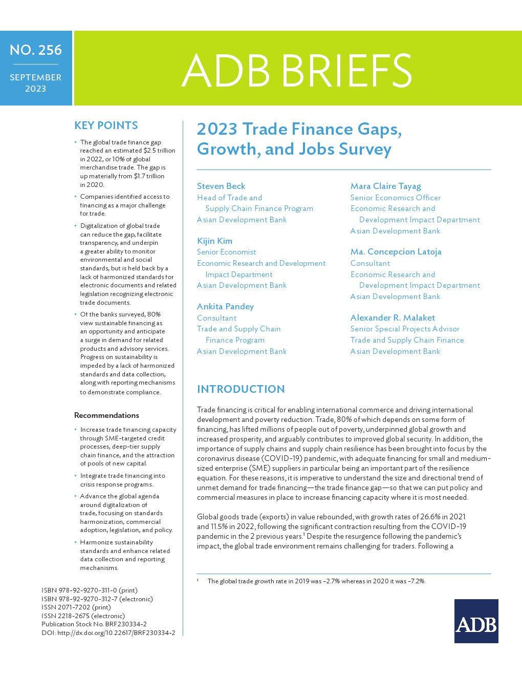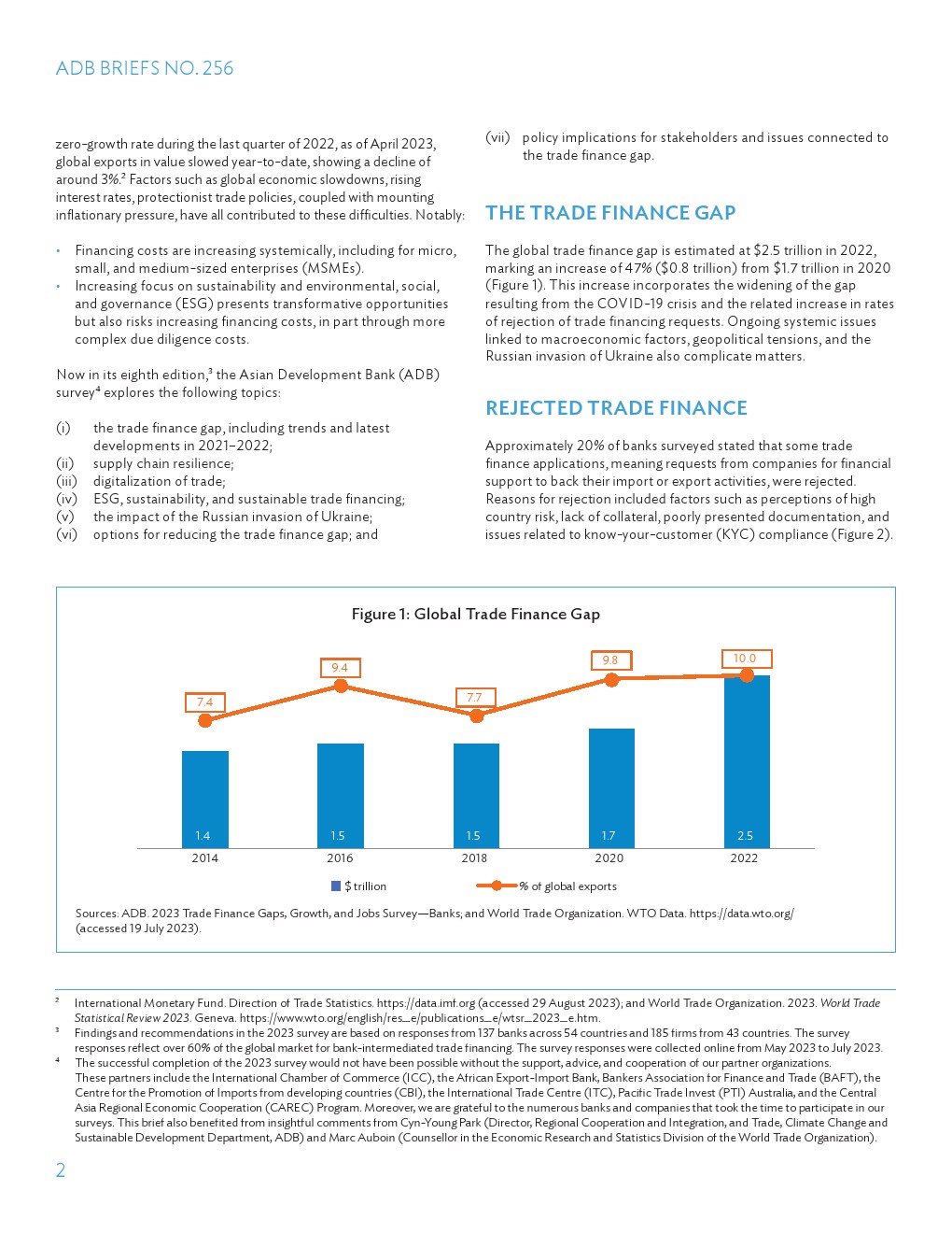贸易融资对于促进国际贸易、推动国际发展和减贫至关重要。80%的贸易依赖于某种形式的融资,贸易使数百万人摆脱了贫困,支撑了全球增长和繁荣,可以说有助于改善全球安全。此外,COVID-19大流行使供应链和供应链复原力受到关注,特别是为中小型企业(SME)供应商提供充足资金是复原力等式的重要组成部分。因此,必须了解贸易融资需求未得到满足的规模和趋势,即贸易融资缺口,以便我们能够制定政策和商业措施,在最需要的地方增加融资能力。