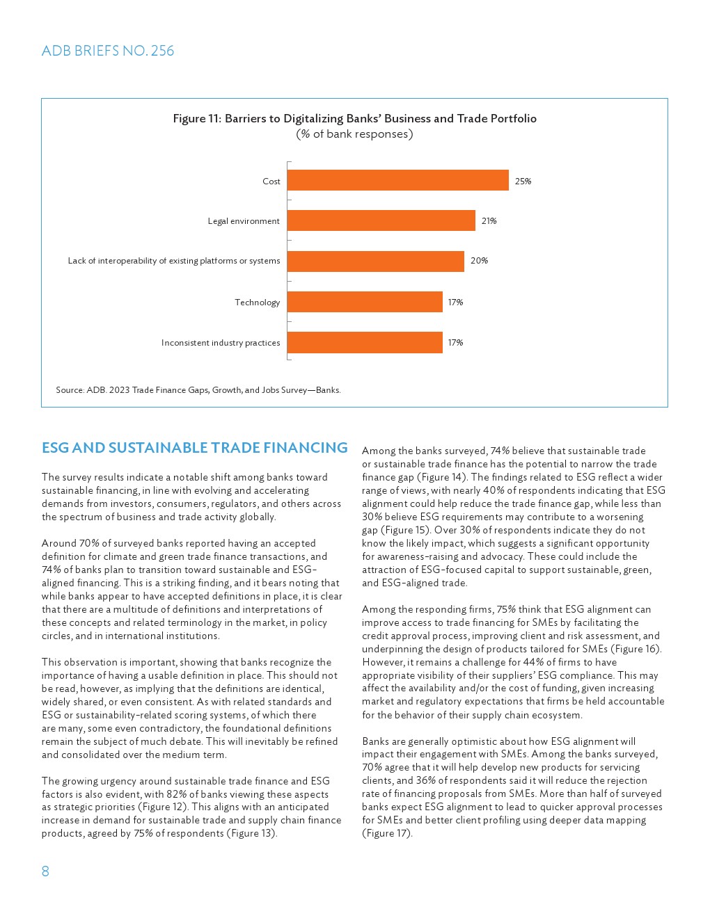 在接受调查的银行中有80%认为可持续融资是一个机会,并预计相关产品和咨询服务的需求将激增。由于缺乏统一的标准和数据收集,以及证明遵守情况的报告机制,可持续性方面的进展受到阻碍。