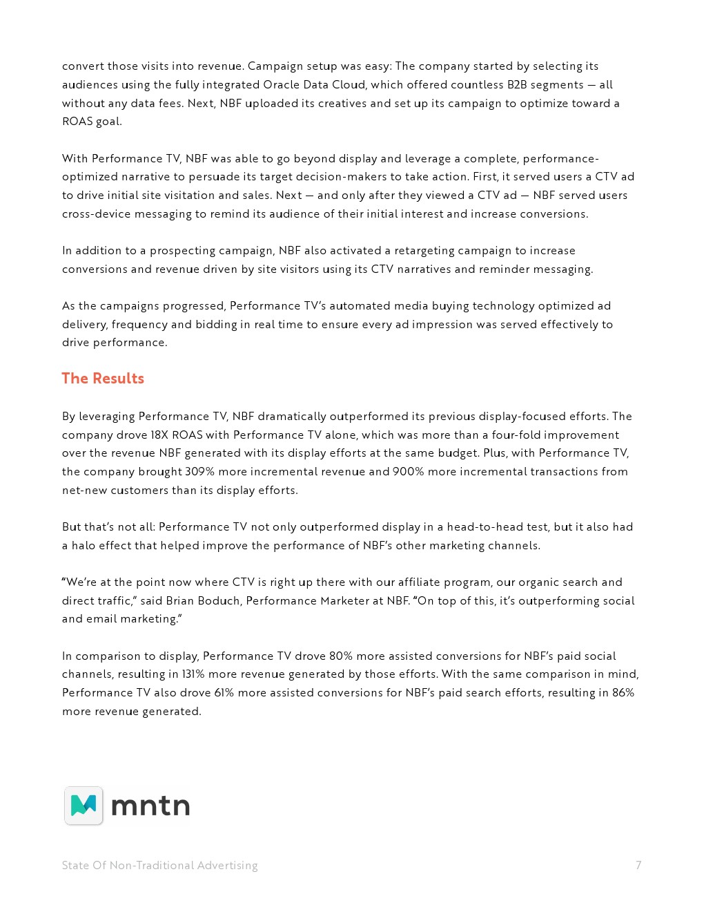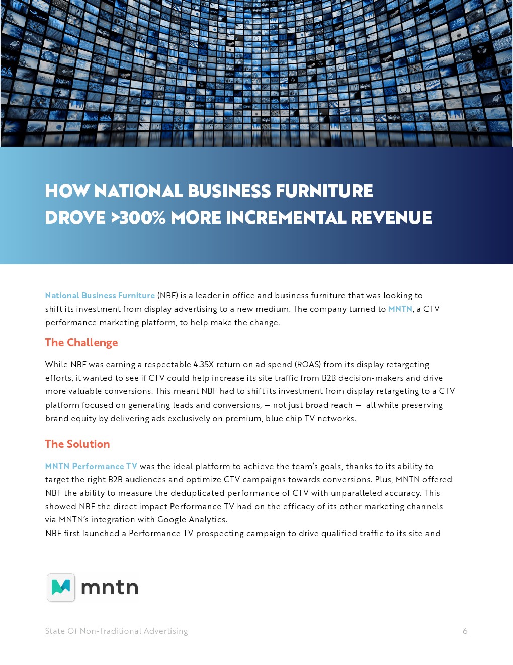 虽然NBF从其展示重定向工作中获得了可观的4.35倍的广告支出回报率(ROAS),但它想看看联网电视是否能帮助其网站从B2B决策者那里增加流量,并推动更多有价值的转化。这意味着NBF必须将其投资从展示广告转向联网电视平台,专注于产生潜在客户和转换,而不仅仅是广泛的覆盖范围,同时通过在优质蓝筹电视网络上独家投放广告来保护品牌资产。