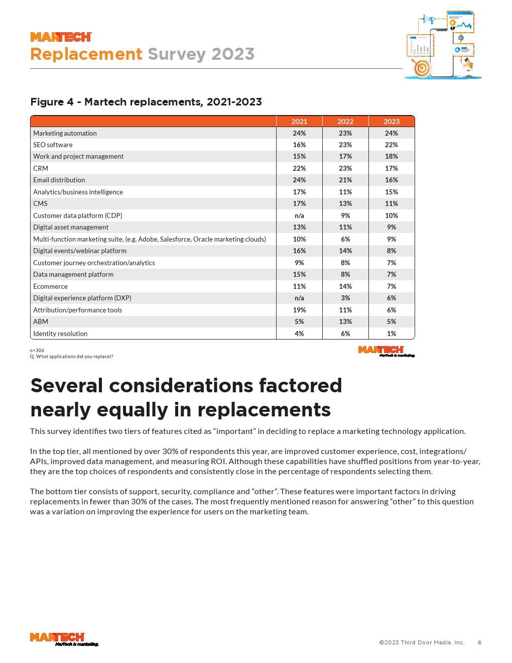 紧随其后的是, 22%的受访者更换了SEO软件,18%的人更换了工作和项目管理,17%的人更换了客户关系管理。更换客户关系管理(CRM)的比例为17%,低于过去几年(20%以上)。其次是被取代率最高的电子邮件营销(16%),与前几年相比也有所下降(去年为21%,前年为24%)。