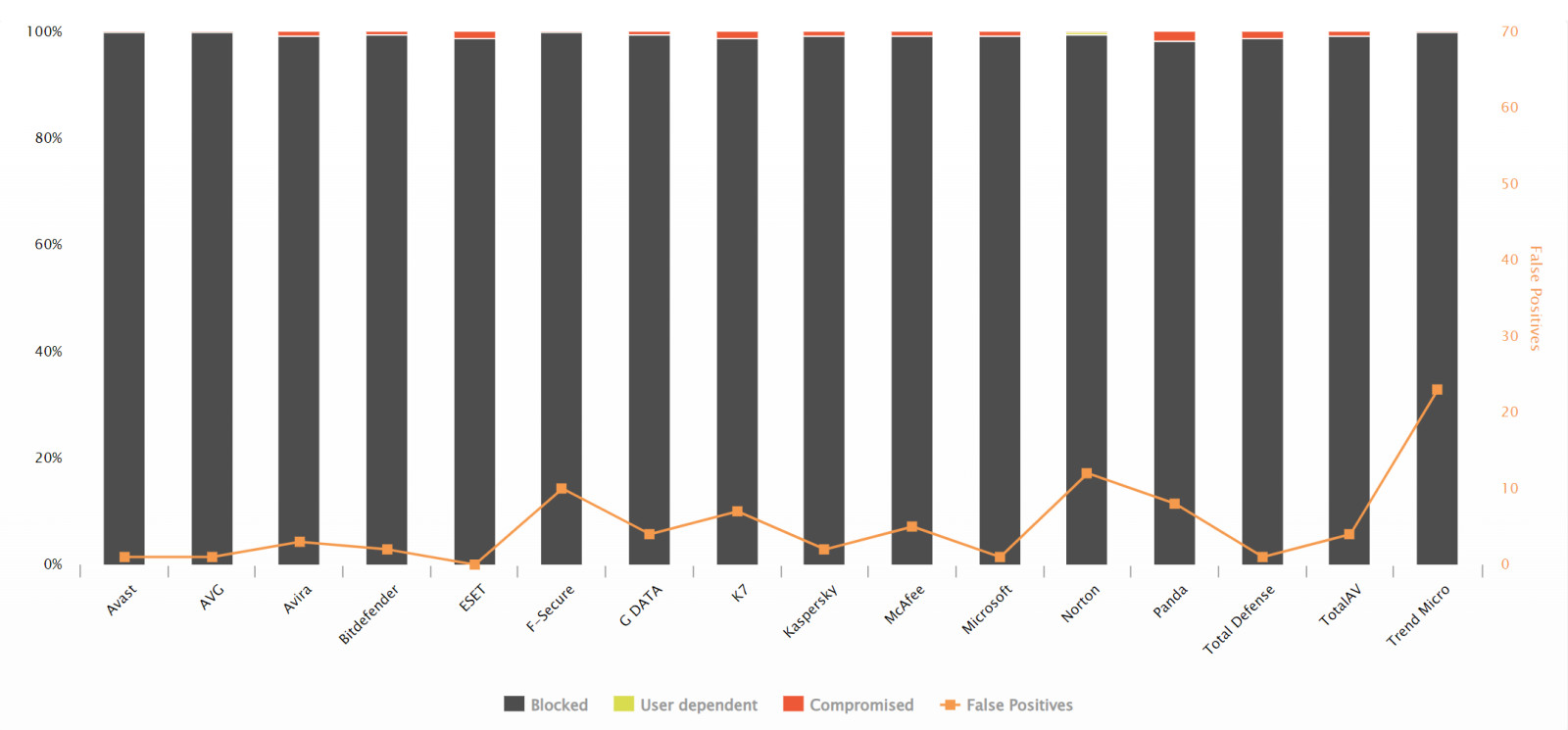 这次真正的明星似乎是 F-Secure,它 100%拦截了所有威胁,但误报率仍然很高。其中最好的是 Avast 和 AVG,它们都基于相同的引擎,100% 拦截了恶意软件样本,只有一个误报。