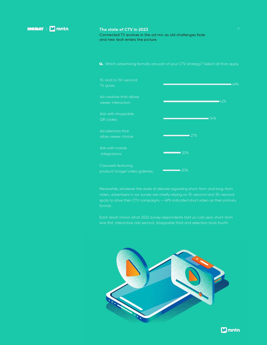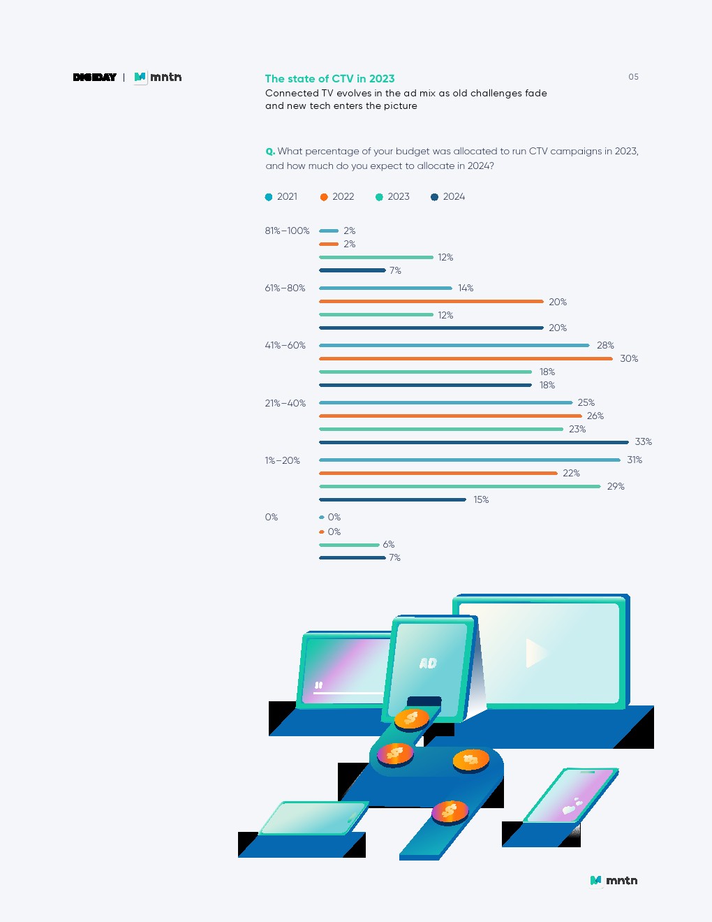 与此同时,将预算从其他广告渠道转移到CTV的受访者中大多数(54%)表示,今年一半或更多的联网电视预算将来自其他渠道的缩减。