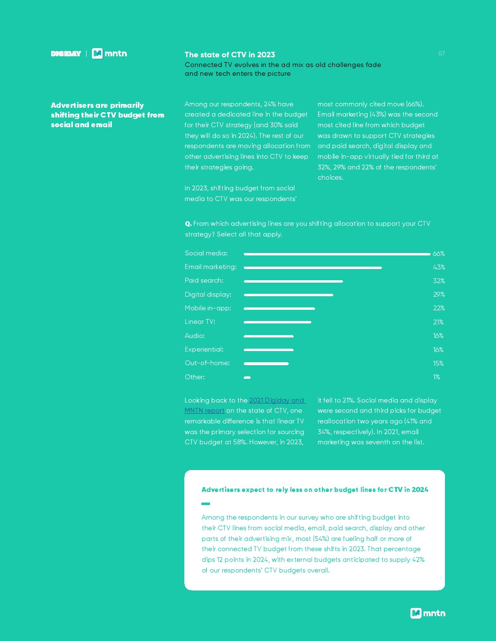 今年最有可能被蚕食的是社交媒体预算,66%的受访者表示,他们将把预算从社交媒体转向CTV。接下来是电子邮件营销(43%),这是与2021年相比的另一个变化,当时它排在榜单的后半部分(19%)。
