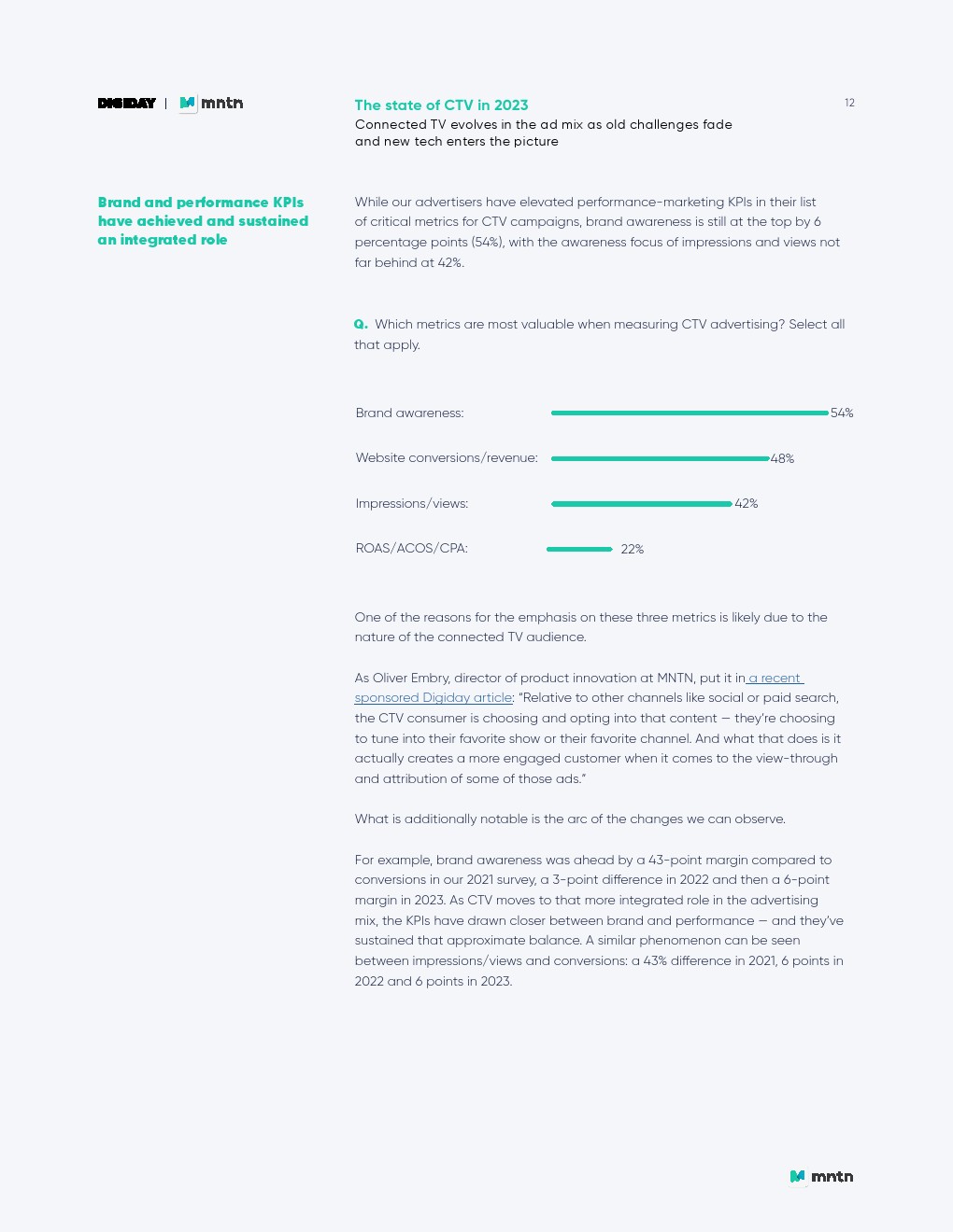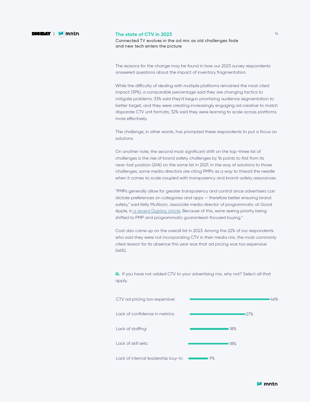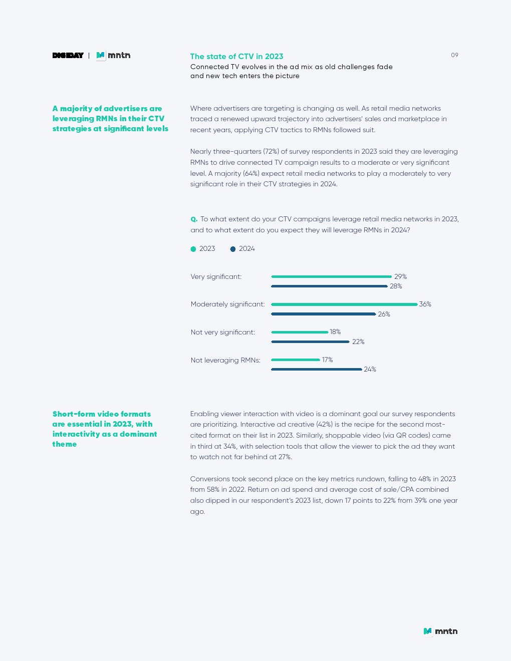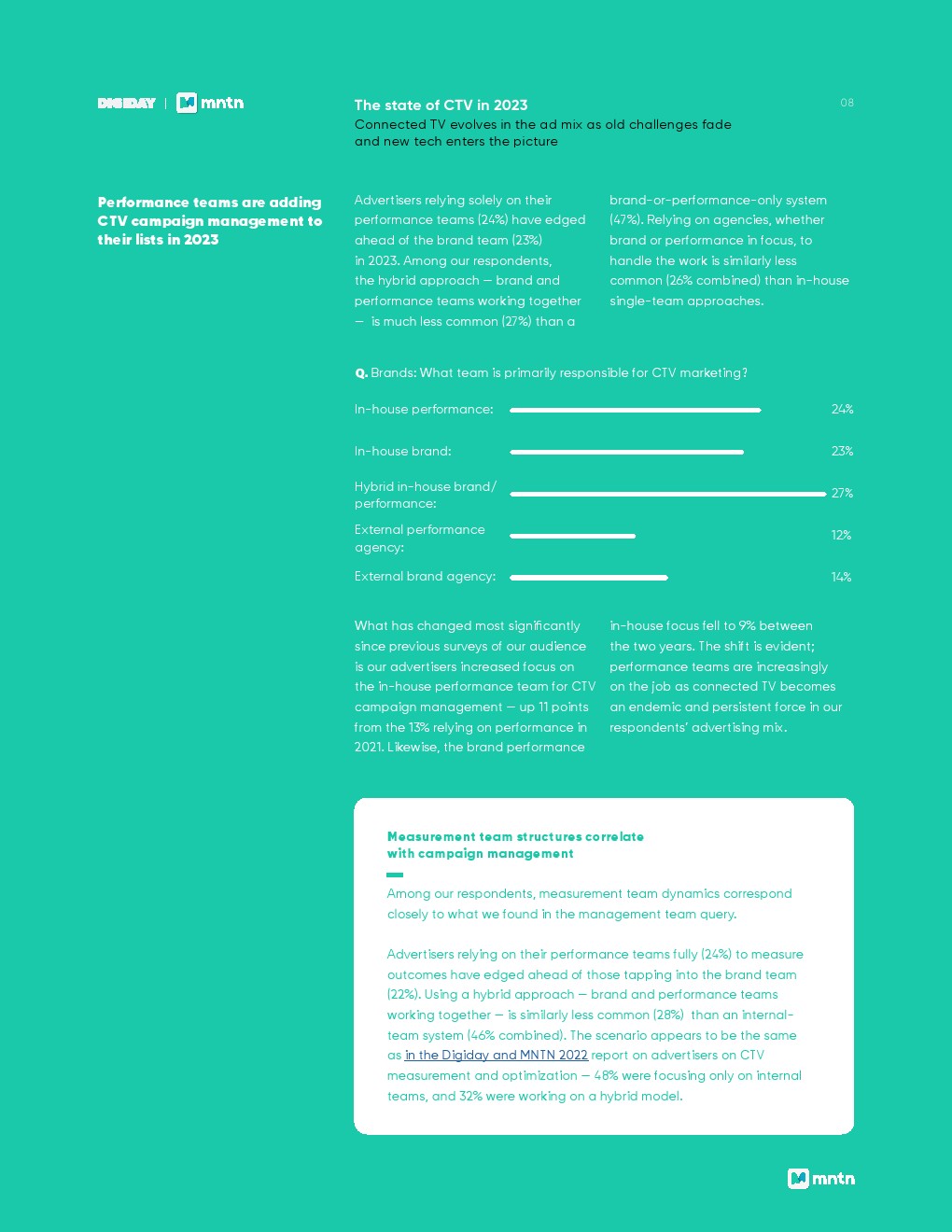 品牌和绩效团队几乎同样有可能负责CTV营销,而内部品牌/绩效混合(27%)是最常见的选择。值得注意的是,认为内部绩效团队主要负责CTV营销的比例从去年的13%上升到今年的24%。