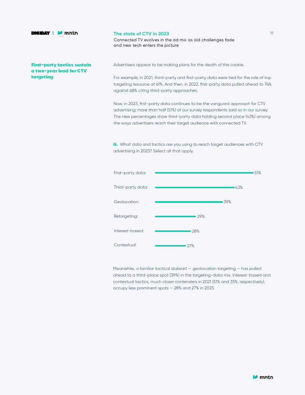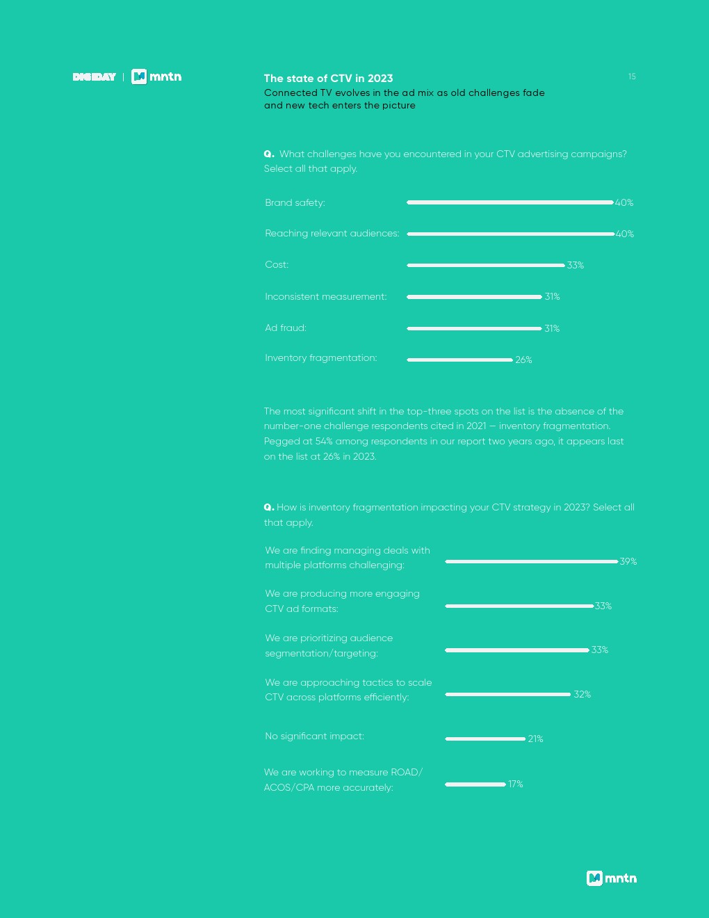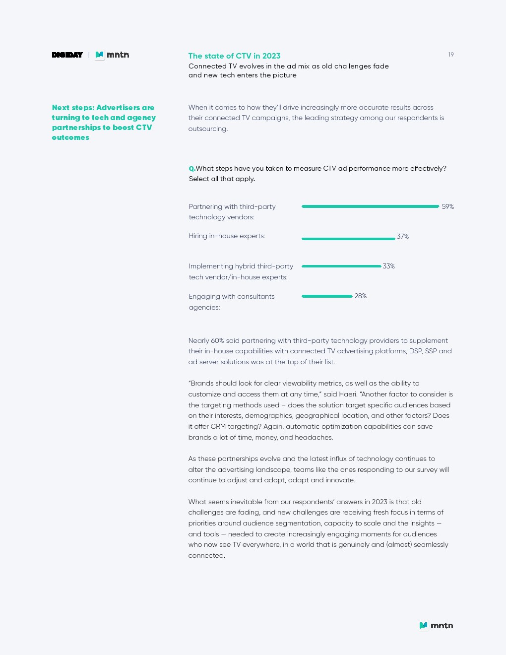紧随其后的是性能目标:提高广告相关性(40%);精准的受众定向(39%),这也是使用CTV广告的主要好处。